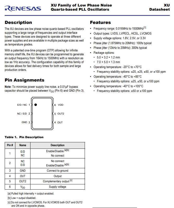 有源晶振特征:頻率范圍:0.016MHz至1500MHz[1] 輸出類型:LVDS、LVPECL、HCSL、LVCMOS 電源電壓選項:1.8V、2.5V或3.3V 相位抖動(1.875MHz至20MHz):典型值100fs相位抖動(12kHz至20MHz):典型值300fs 包裝選項: 5.0×3.2×1.2毫米,7.0×5.0×1.3毫米,工作溫度:-20攝氏度至+70攝氏度 頻率穩定性選項:20、25、50或100ppm,工作溫度:-40攝氏度至+85攝氏度 頻率穩定性選項:25、50或100ppm,工作溫度:-40攝氏度至+105攝氏度 頻率穩定性選項:50或100ppm.