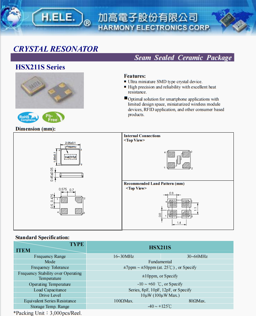 X2C026000B71HB-Z晶振,HELE進口晶振,無人機攝像模塊晶振,臺灣加高晶振公司,HELE晶振,小尺寸晶振,2016晶振,超小型晶振,低損耗晶振,高品質晶振,高精度晶振,程控交換機晶振,無人機晶振,加高晶振特點:超小型尺寸,臺灣加高晶振公司,特點:超小型貼片型晶體器件。精度高,可靠性好,耐熱性好。適用于設計空間有限的智能手機應用程序、初始化無線模塊設備、RFID應用程序和其他基于消費者的產品.