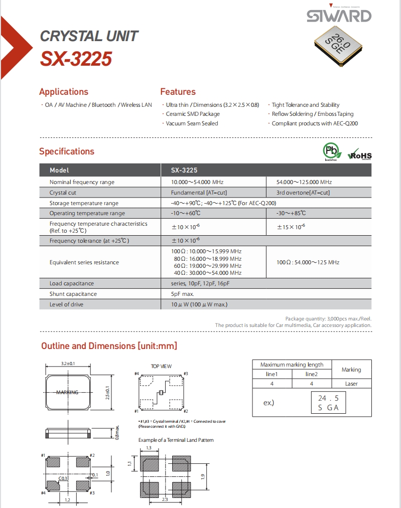 | XTL571150-F98-063 | Siward晶振 | SX-3225 | 24 MHz | ±15ppm | 18pF | -20 ℃~75 ℃ |