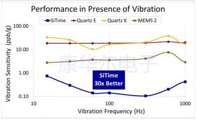 振動(dòng)靈敏度或g靈敏度(以ppb/g表示)表示由加速力引起的頻率變化.圖1繪制了以ppb/g為單位的正弦振動(dòng)引起的噪聲雜散,以證明與基于石英的振蕩器相比,SiTimeMEMS振蕩器在不同頻率下的振動(dòng)靈敏度較低. 此外,SiTime振蕩器在1.5x0.8mm的小型封裝(kHz振蕩器)和2.0x1.6QFN和SOT23-5小型封裝(MHz振蕩器)中提供0.1ppb/g的性能.石英設(shè)備必須使用大型專(zhuān)用包裝才能實(shí)現(xiàn)較低的g敏感度.