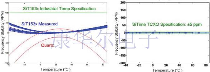 圖4a顯示了基于SiT1532MEMS的32.768kHz振蕩器的頻率穩(wěn)定性與溫度特性曲線.工業(yè)虛線(<100PPMp-p)的SiT1532規(guī)格限制以藍(lán)色虛線表示.紅色曲線顯示了使用基于石英的XTAL音叉類(lèi)型的32.768kHz振蕩器的典型規(guī)格極限.圖4b顯示了基于SiT1552MEMS的TCXO(溫度補(bǔ)償振蕩器)的頻率穩(wěn)定性,該器件已在多個(gè)頻率點(diǎn)上進(jìn)行了出廠校準(zhǔn)(微調(diào)),以確保在整個(gè)溫度范圍內(nèi)具有極高的穩(wěn)定性.