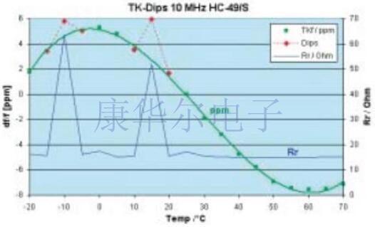 ●檢查活動驟降:在室溫下完美工作的石英晶體在溫度范圍內可以顯示出更高的諧振阻抗和更強的頻率跳躍.其原因是主共振與其他形式的振動的干擾共振的耦合,通常僅在狹窄的溫度范圍內發生,并導致所謂的活性下降.具有條紋石英的小型化石英晶體特別容易受到這種傾角的影響,即窄矩形石英盤,尤其是較低的頻率.