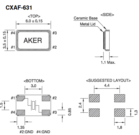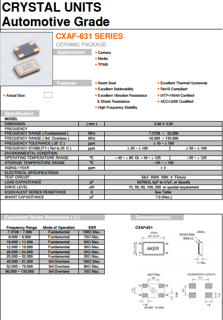 AKER晶振,安碁諧振器,CXAF-631水晶振子,科技不斷的進步,安碁科技亦不斷提升技術服務.透過與客戶緊密的互動,了解客戶需求,提供客戶全方位的技術支援─TotalSolution;貫徹安碁誠信為首、專業化客戶服務及品質優先的理念.公司愿景-追求卓越,不斷創新,與客戶一同成長,成為客戶在頻率控制元件領域的最佳伙伴.安碁科技成立于西元1990年,主要從事石英元件,貼片晶振產品的研發、制造及銷售.擁有深厚的研發技術底蘊,為晶體振蕩器之專業制造公司.